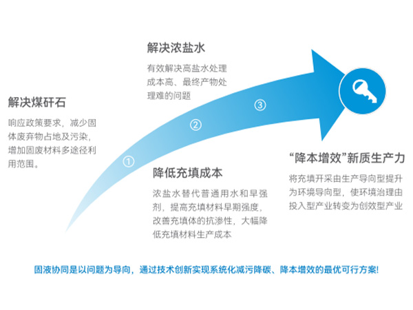 “固液协同”处理技术是指以固体废物(如煤矸石、尾矿库、粉煤灰等)和液体废物(如矿井高盐水、煤化工产生的高盐有机废液等)进行协同处理,再通过一系列的物理、化学等方法进行固化使其稳定化、无害化,达到充填材料的标准并应用于井下充填的一种创新型环保技术。