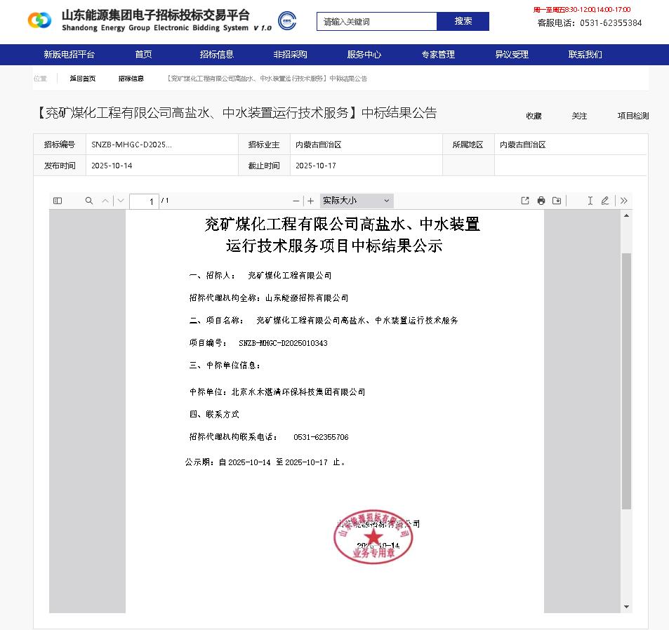 近日,水木湛清集团凭借多年在市政及煤化工废水处理领域建设及运营服务中的优势,在与多家实力企业的激烈竞争中脱颖而出成功中标。该中标公告已于2025年10月14日,在山东能源集团电子招标投标交易平台正式公开发布。